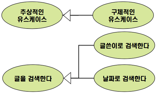 구체적인 유스케이스에서 추상적인 유스케이스 방향으로 끝이 삼각형으로 표현된 화살표를 실선으로 연결하여 표현한다.