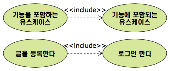 포함하는 유스케이스에서는 포합되는 유스케이스 방향을 점선 화살표로 연결하고 <<include>>라고 표기한다.