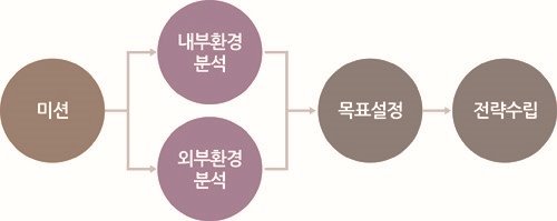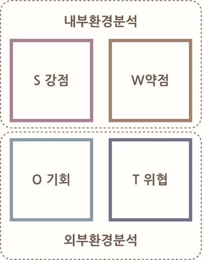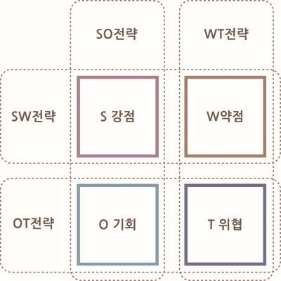 기업이 가진 강점(Strength)과 약점(Weakness), 외부 환경의 기회(Opportunity)와 위협(Threat) 요인을 분석하고 평가하여 약점은 보완하고 강점은 최대화 하며, 위협요인을 대처하며 기회를 포착하여 실행하는데 초점을 둔다.
