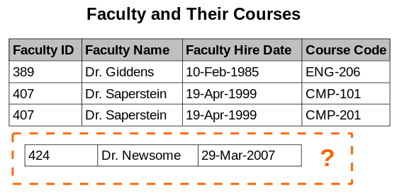 삽입 이상 (Insertion Anomaly) : 불필요한 정보를 함께 저장하지 않고서는 어떤 정보를 저장하는 것이 불가능하다.