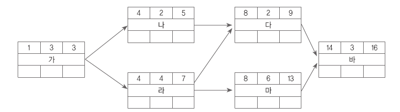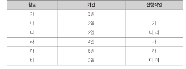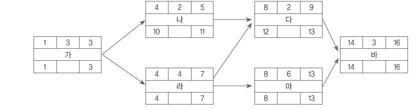 바는 다,마라는 선행 작업이 있으므로 다,마 다음에 수행된다.