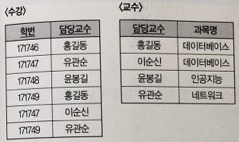 그러나 담당교수는 (수강_교수)테이블에서 후보키가 아니다.