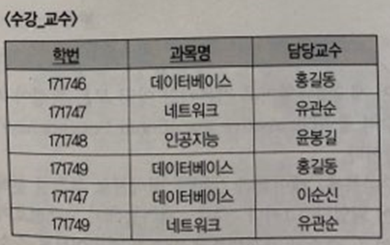 홍길동 -> 데이터베이스, 이순신 -> 데이터베이스, 유관순 ->